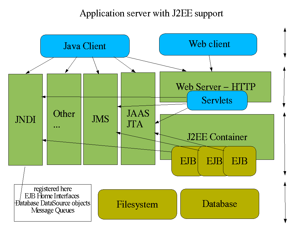 glue: JNDI registry, JMS (messaging specification), JCA (connector architecture), JAAS (security spec)